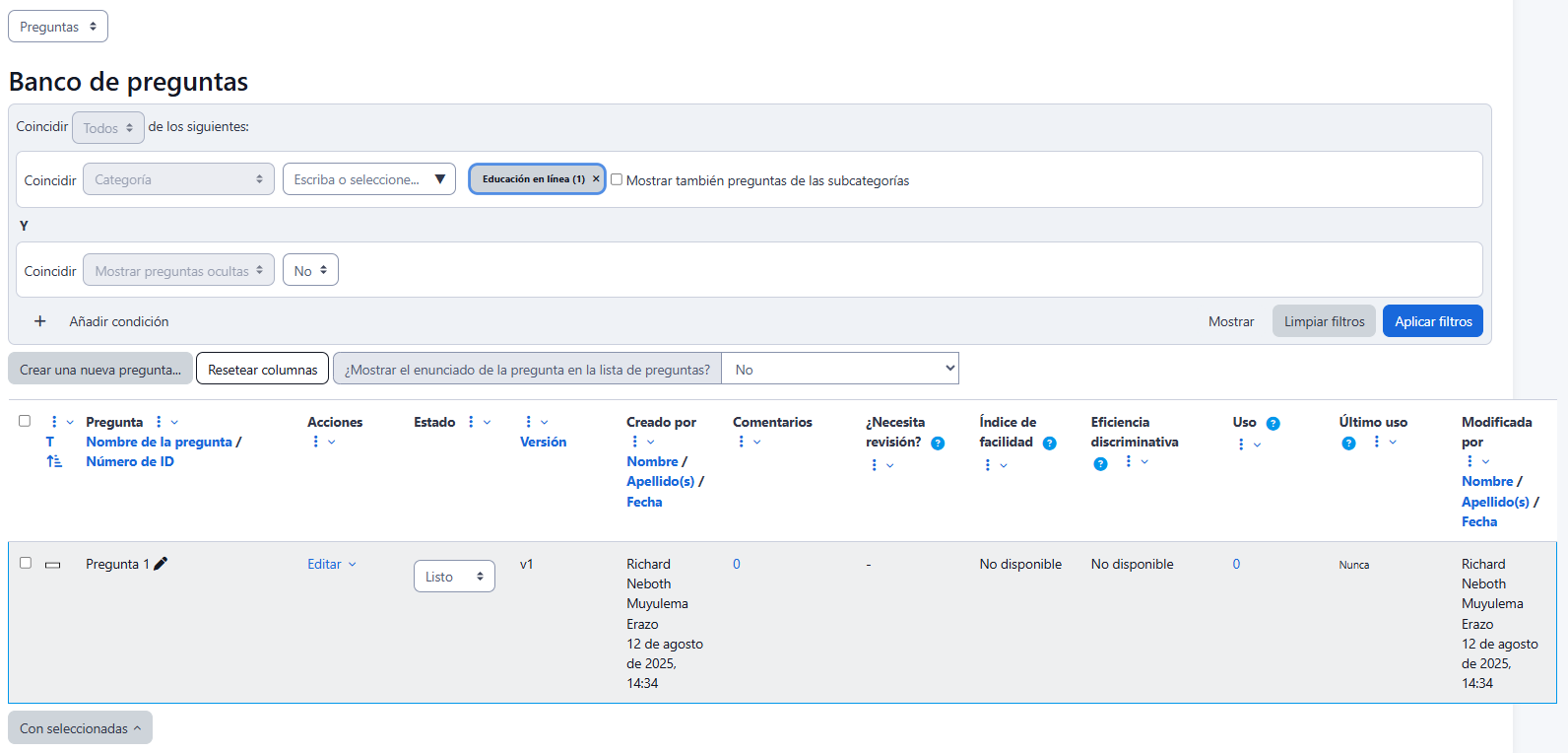 - "Estado de pregunta", indica si la pregunta está Lista para usarse o si está en Borrador.
