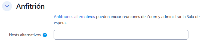 - "Hosts alternativos": Este campo permite asignar a uno o varios usuarios como coanfitriones de la reunión programada. Los hosts alternativos cuentan con privilegios de anfitrión, lo que significa que pueden: