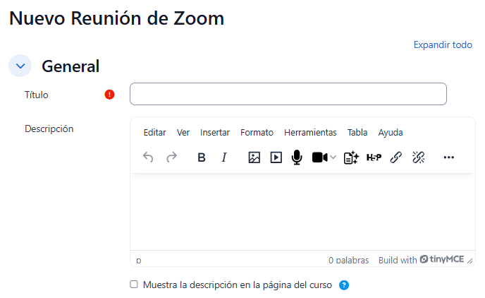 - Puede marcar Muestra la descripción en la página del curso si desea que se vea bajo el título.