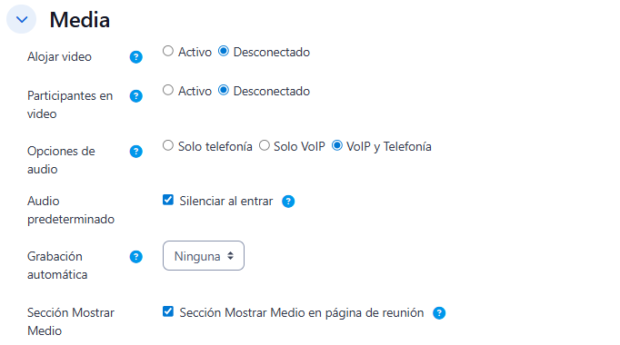 - "Sección Mostrar Medio": Permite visualizar o desplegar todas las configuraciones relacionadas con video, audio y grabación.