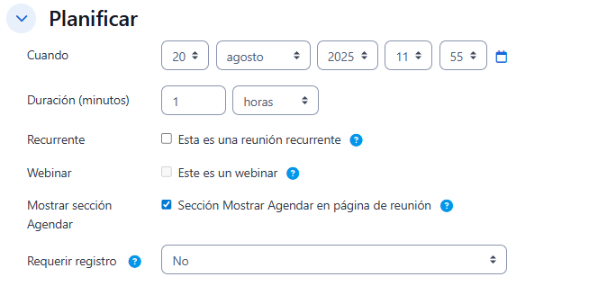- "Requerir registro": Permite que los participantes se registren antes de ingresar a la reunión.