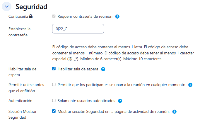- "Contraseña": Permite proteger el acceso a la reunión mediante una clave