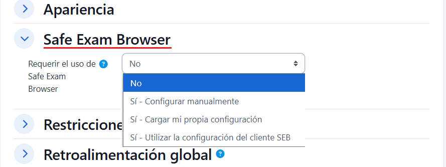 - Dentro de la configuración del cuestionario, en la sección Safe Exam Browser.