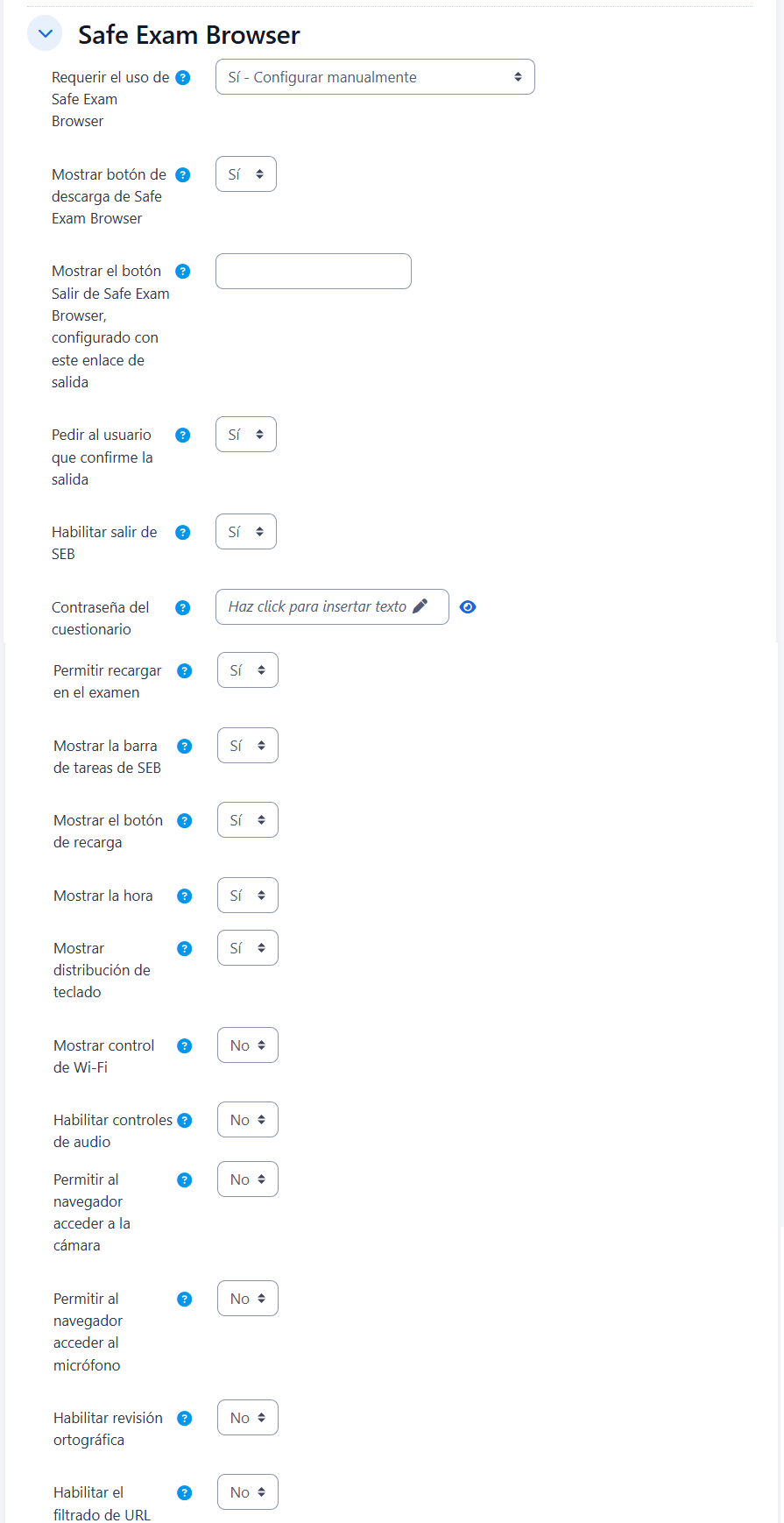 - Sí - Utilizar la configuración del cliente SEB: No existen configuraciones de SEB guardadas en Moodle. El cuestionario puede hacerse con cualquier configuración de SEB.