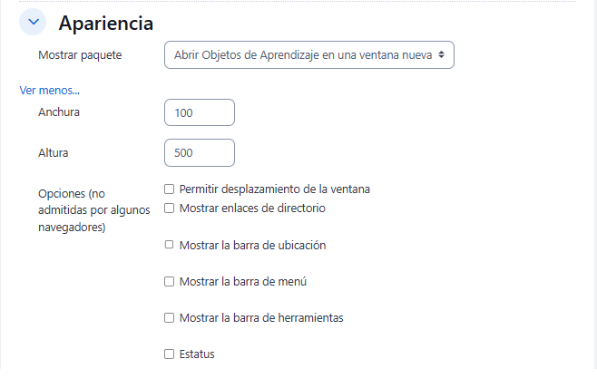Opción "Mostrar paquete" SCORM, puede seleccionar "Abrir Objetos de Aprendizaje en una nueva ventana", o en la "ventana actual" del curso.