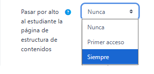 - Pasar por alto al estudiante la página de estructura de contenidos, si selecciona la opción Siempre el estudiante no visualizará este elemento.