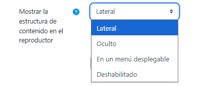 - Mostrar la estructura de contenido en el reproductor, indica donde se muestra la estructura del SCORM durante su visualización o si queda oculta.