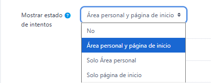 - Mostrar estado de intentos, permite mostrar un resumen de los intentos realizados en la página de inicio, área personal o en ambos.