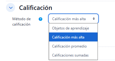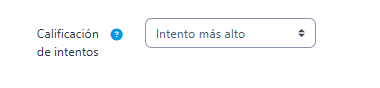 - "Calificación de intentos", al permitir varios intentos, esta opción específica si el intento más alto, promedio, primer intento o último es el que se registra en el Libro de Calificaciones. La opción de último intento completado no incluye los intentos ocn un estado fallido.
