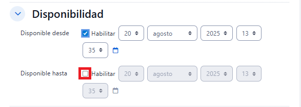 - De clic en el casillero "Habilitar" , para restringir la realización de la Actividad a fechas determinadas.