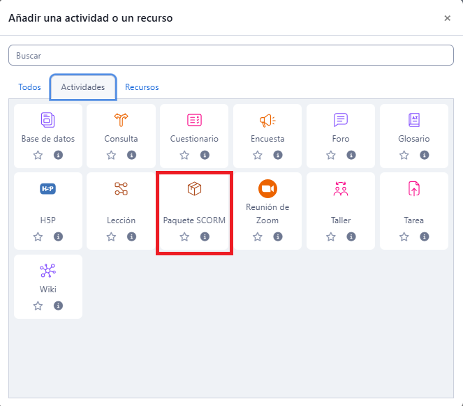 - Seleccionar la actividad "SCORM".