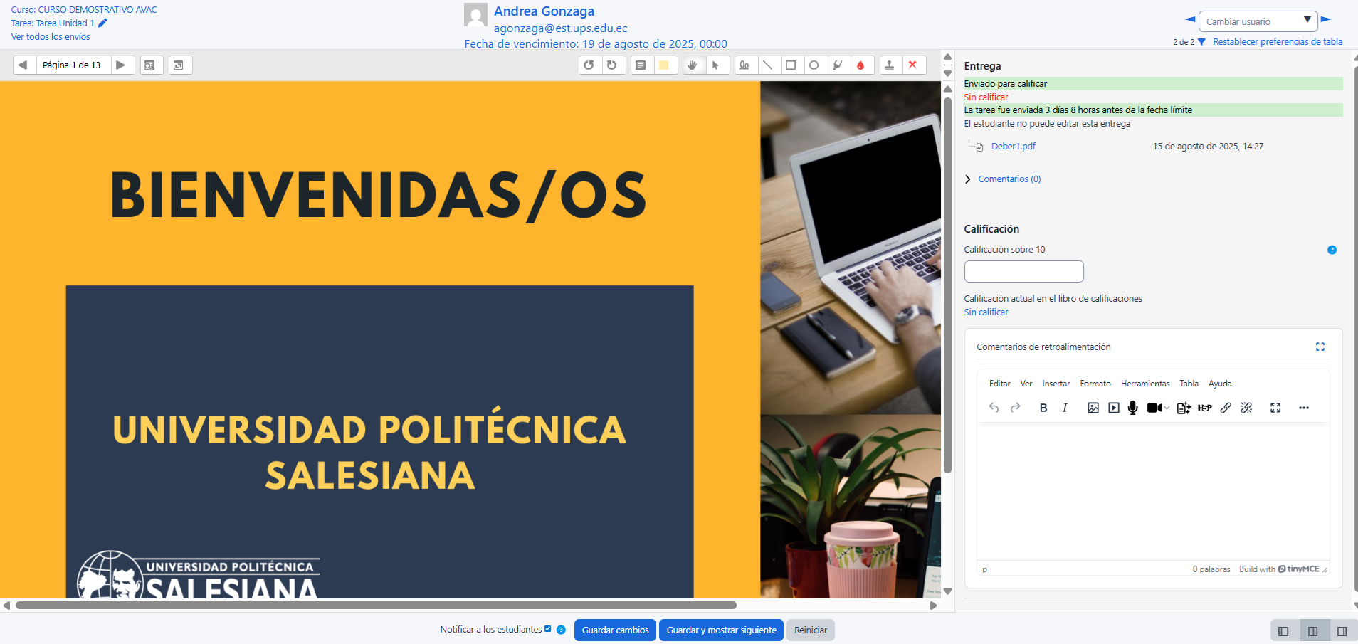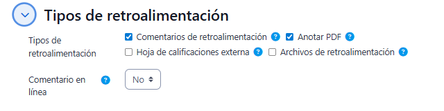 Permite a los docentes agregar anotaciones y comentarios directamente sobre archivos PDF enviados por los estudiantes, facilitando la retroalimentación directa en el trabajo. Para usarla, el docente debe activarlo en la configuración: opción "Tipo de retroalimentación" -->