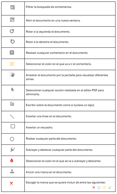 A continuación, se detallan los íconos que se disponen en el editor PDF: