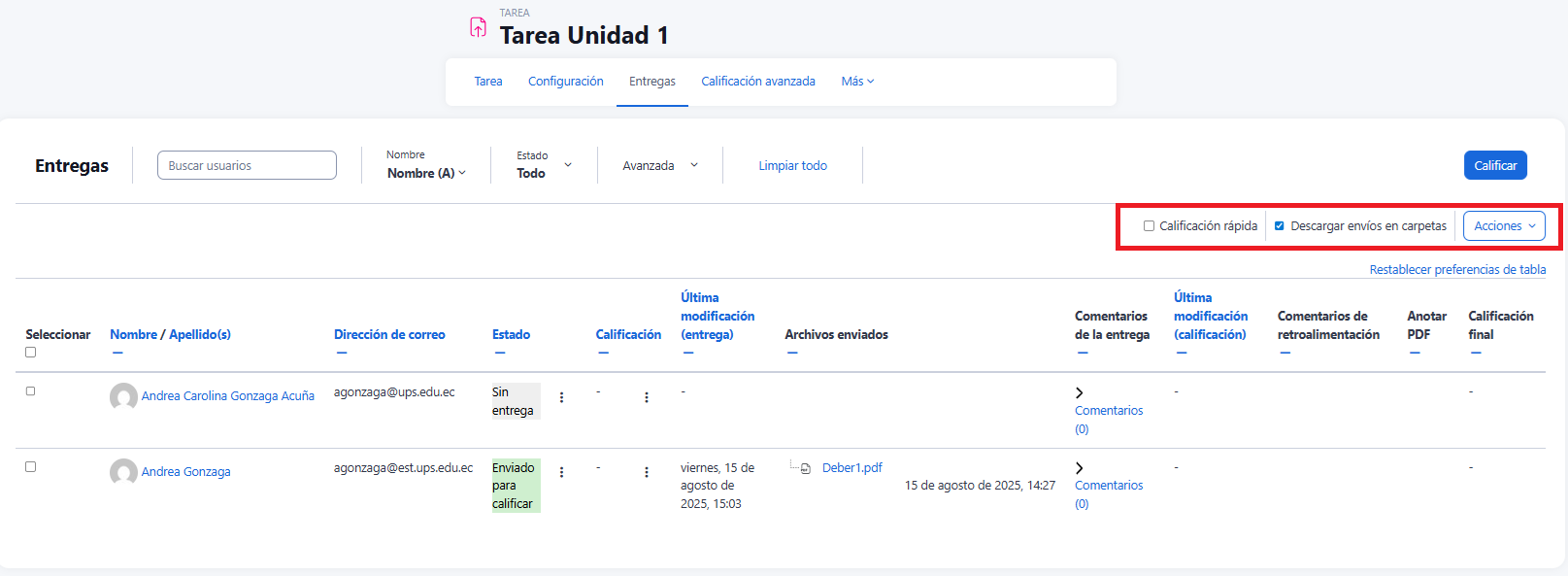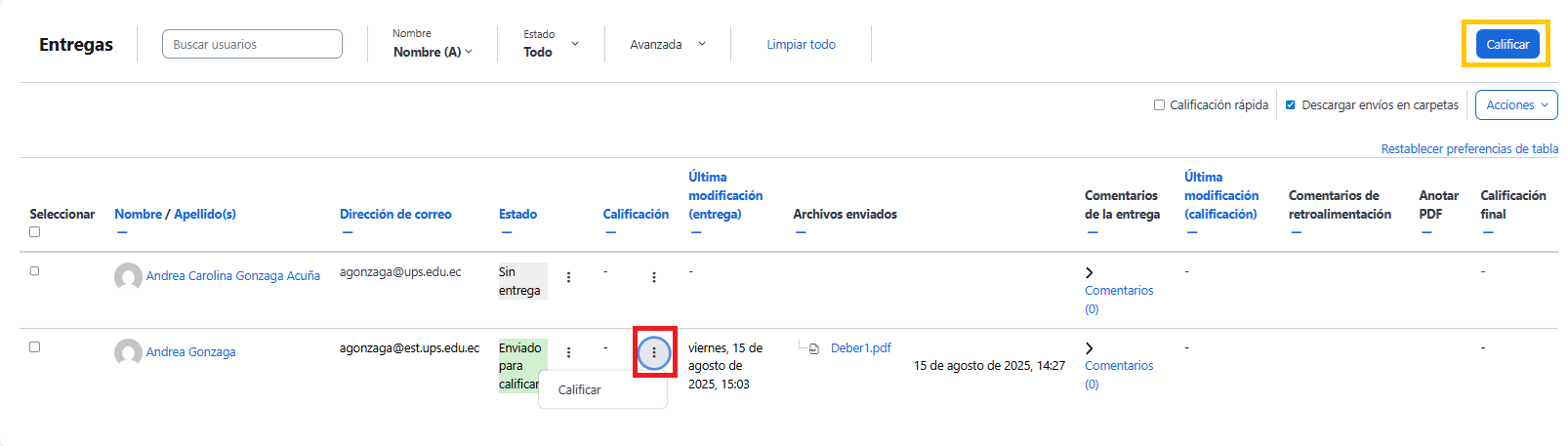 Para efectuar la calificación de la actividad tarea, disponemos de dos opciones: