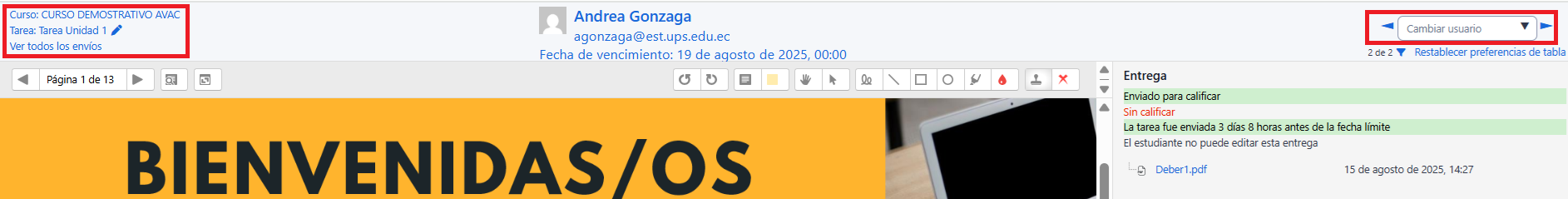 También, se puede navegar entre los trabajos de los estudiantes desde la opción "Cambiar usuario".