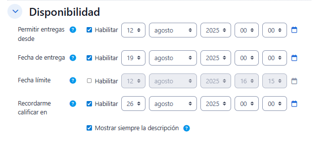 Permitir entrega desde, si está habilitado los estudiantes no podrán efectuar entregas antes de la fecha. Por lo contrario, si se encuentra deshabilitado los estudiantes podrán comenzar la entrega de inmediato.