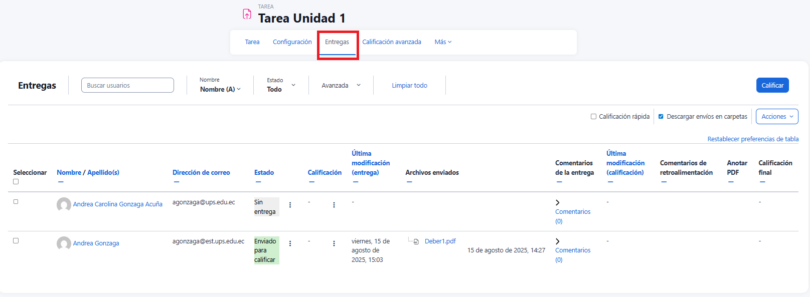 Ingrese a la opción "Entregas", el profesor accede a los trabajos enviados por los estudiantes para descargar, revisar y evaluar.
