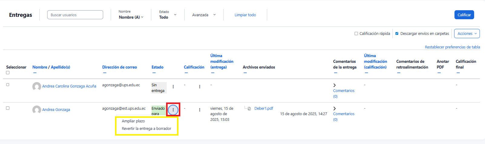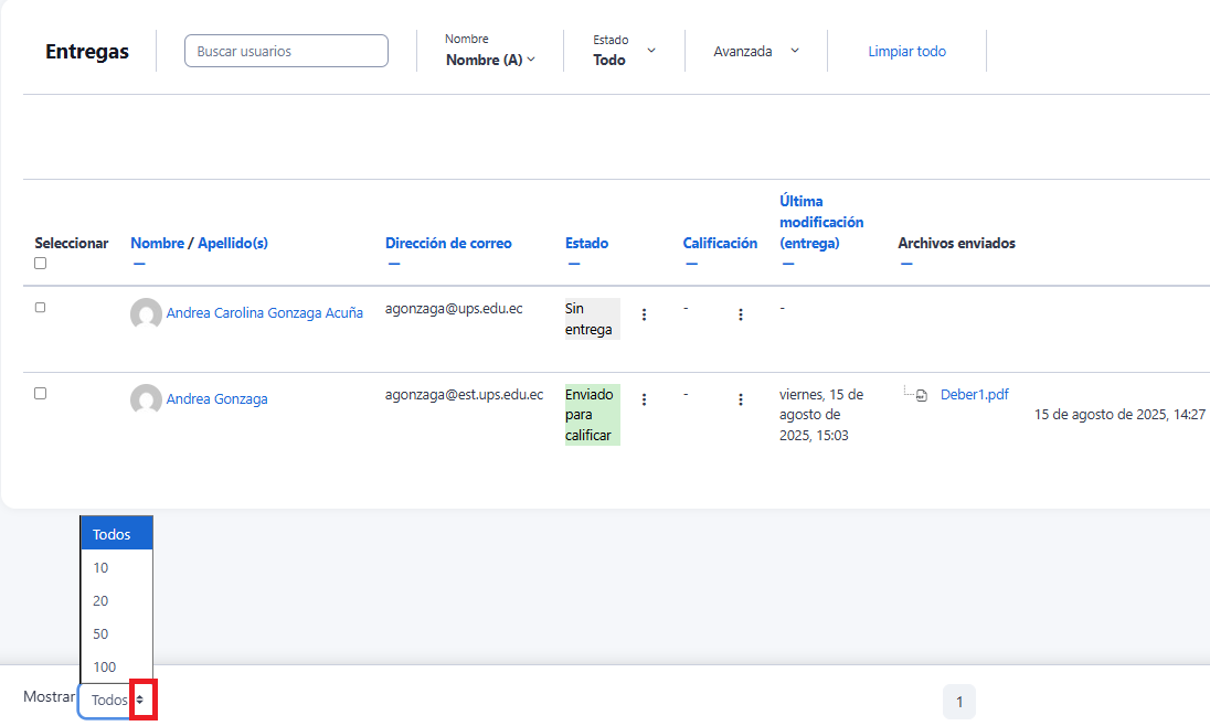 , permite dirigirse a la visualización de la ventana de las entregas de los estudiantes para realizar la asignación de calificación.