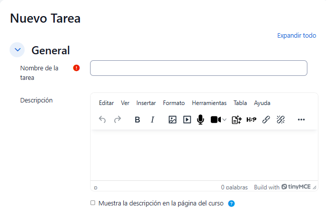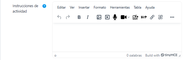 La tarea puede requerir que los estudiantes escriban texto directamente en un campo utilizando el editor de texto. Una tarea también puede ser utilizada para recordar a los estudiantes tareas del "mundo real" que necesitan realizar y que no requieren la entrega de ningún tipo de contenido digital. Por ejemplo, presentaciones orales, prácticas de laboratorio, entre otros.
