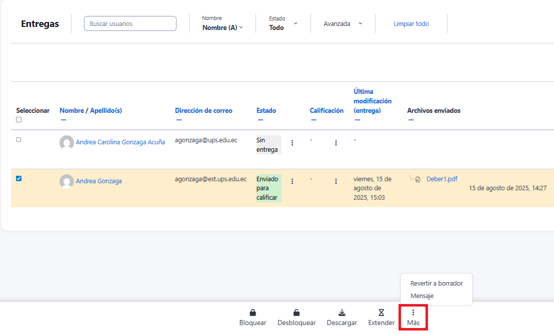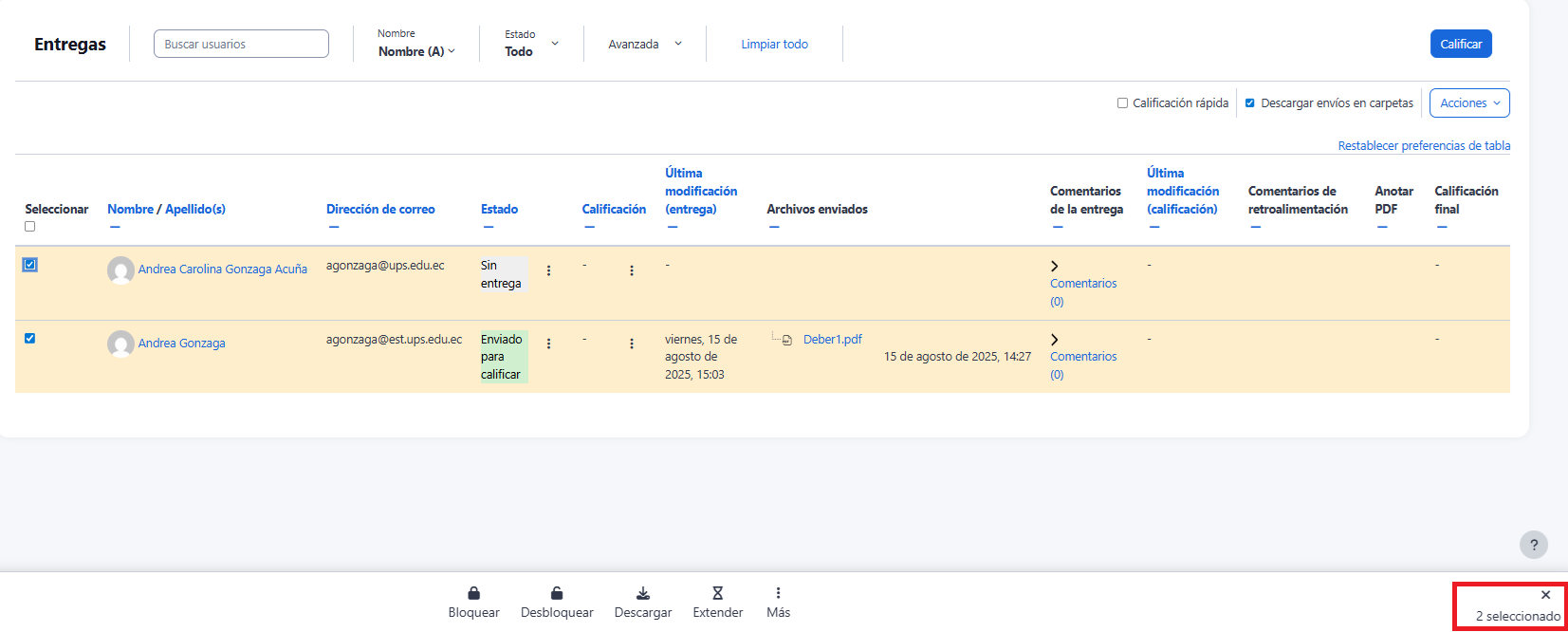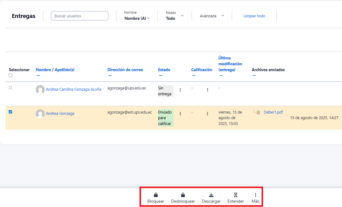 Al marcar los estudiantes en la columna Seleccionar se muestra un nuevo menú en la parte inferior con las siguientes acciones: