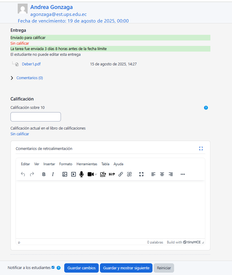 Se dispone de un editor de texto para poner un comentario al estudiante.