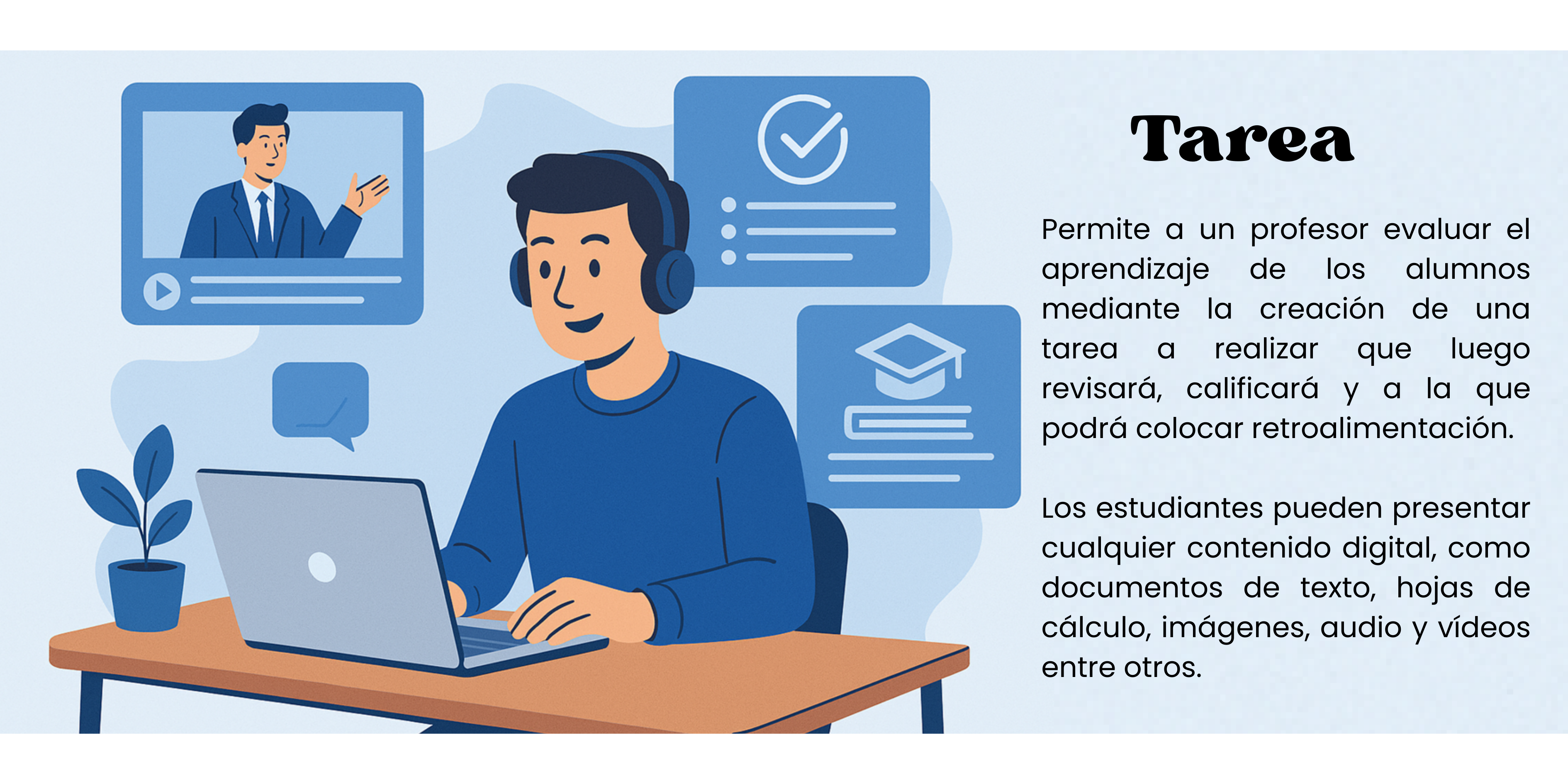 Para tareas en grupo, el módulo tiene la capacidad de aceptar tareas de uno de los miembros del grupo y que está quede vinculada al resto.