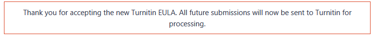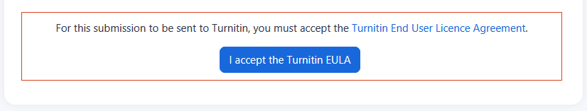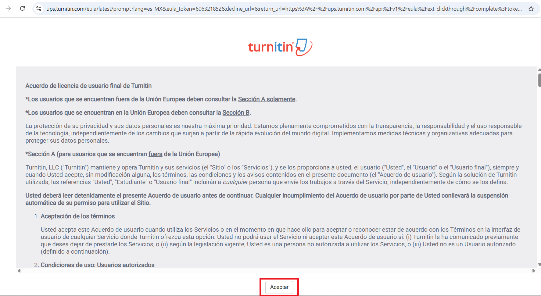 El estudiante al momento de realizar la entrega de su tarea o participación en la actividad visualizará el siguiente mensaje: "Para que este envío sea transmitido al aplicativo Turnitin, debe aceptar el Acuerdo de licencia de usuario final de Turnitin". Esto permite que el documento cargado pueda ser analizado por Turnitin.