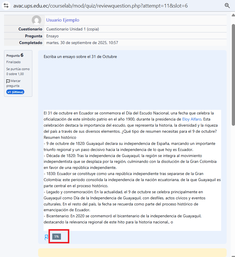 Por otra parte, en la siguiente imagen observamos una pregunta tipo ensayo de la actividad cuestionario, en la cual el porcentaje de similitud lo encontraremos al momento de que el Docente proceda a calificar la pregunta.