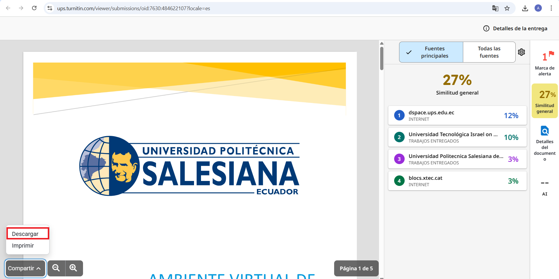 Luego de aceptar los términos de condiciones, nos permite visualizar el informe con el porcentaje de similitud. En caso de necesitar efectuar la descarga de este informe, en la parte inferior nos brinda la opción "Descargar".