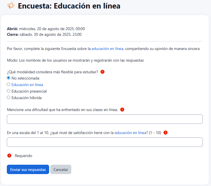 En la actividad Encuesta, los estudiantes responden a una serie de preguntas diseñadas por el docente, cuyos resultados servirán para el análisis y la reflexión del grupo.