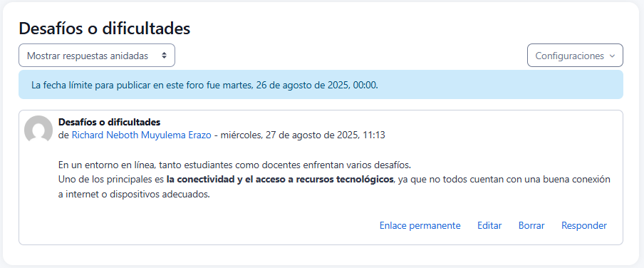 - Busque las opciones "Editar" o "Borrar" junto a su mensaje, si el docente lo permite.