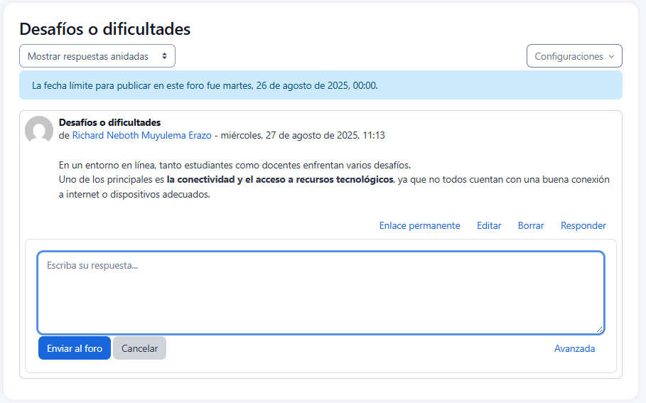 Es una herramienta de comunicación que permite a los estudiantes responder a mensajes anteriores y generar hilos de conversación organizados.