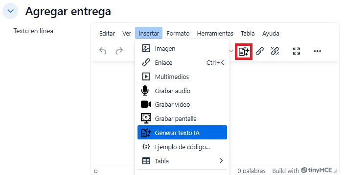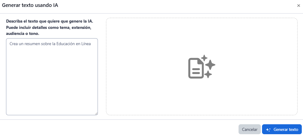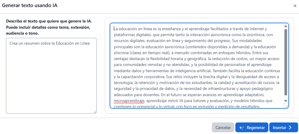 Permite crear o complementar contenido automáticamente en el editor de texto, facilitando respuestas, resúmenes y textos en actividades o recursos