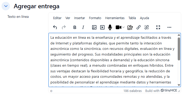 - Seleccione la actividad o recurso donde necesite redactar un texto, por ejemplo una tarea.