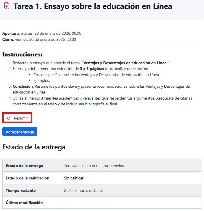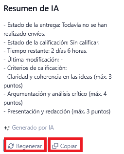 El botón Resumir con IA le permite generar un resumen automático del contenido disponible en una actividad o recurso, facilitando la comprensión de textos extensos y el repaso de información clave.