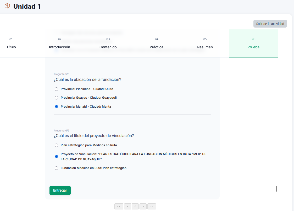 En otro ejemplo, visualizamos que el docente incluyó en su creación de contenido preguntas con calificación, para enviar la respuesta debemos hacer clic en el botón "Entregar".