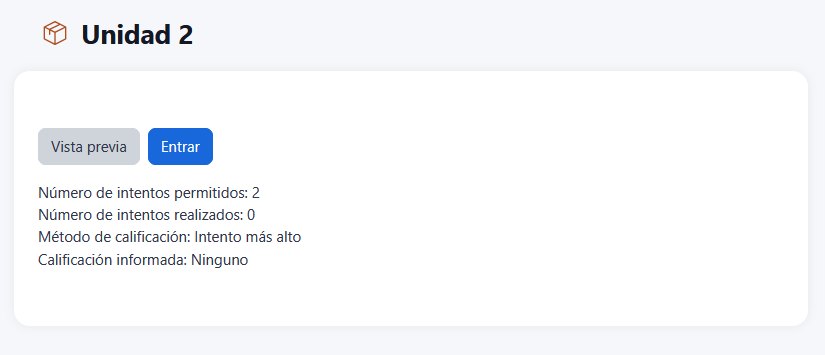, donde le saldrá un resumen de la actividad. Este resumen lo visualizará cada vez que ingrese a la actividad. Número de intentos permitidos, Número de intentos realizados, Calificación del intento, Método de calificación, Calificación informada y la opción de volver a ingresar.