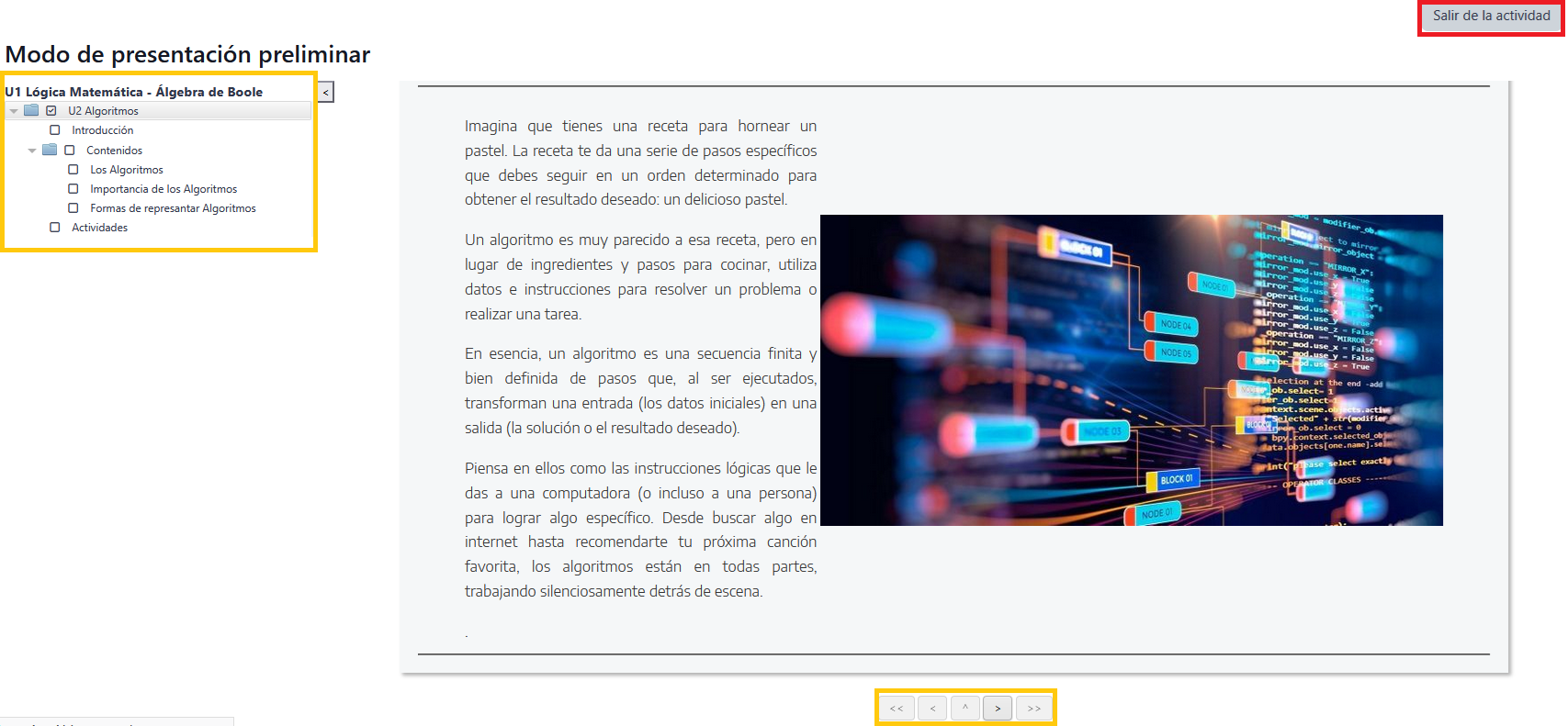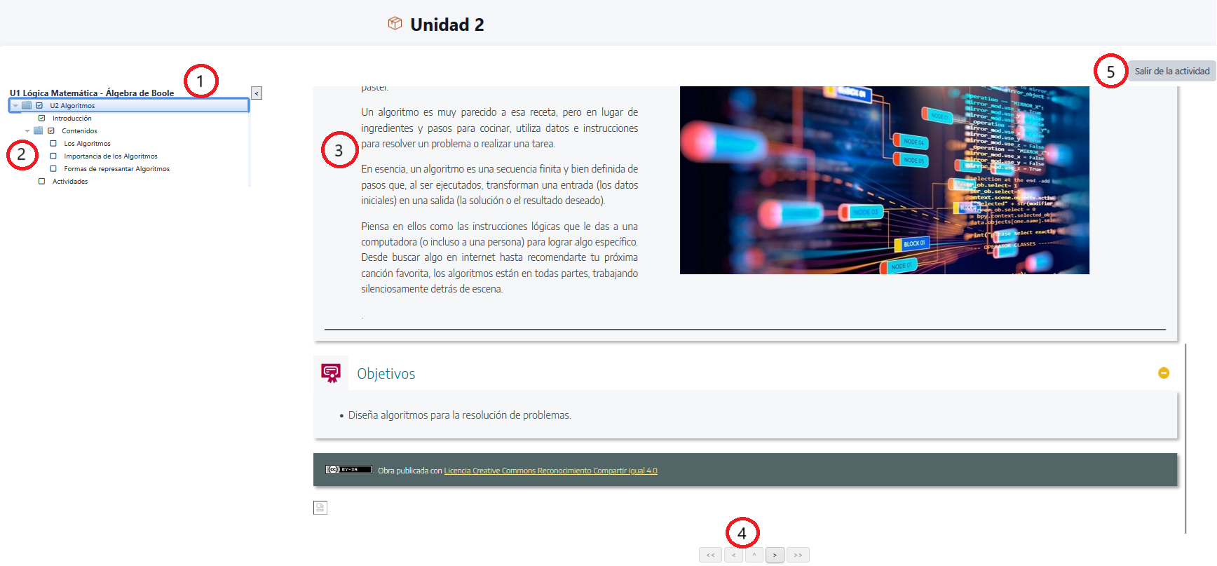 Se mostrará el titulo de la actividad (1), la tabla de contenidos (2), desarrollo de la temática (3), botones de desplazamiento (4) y el botón Salir de la actividad(5).