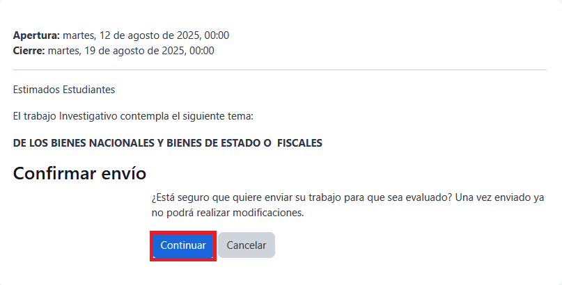 Para realizar la entrega del documento, el estudiante debe hacer clic en el botón