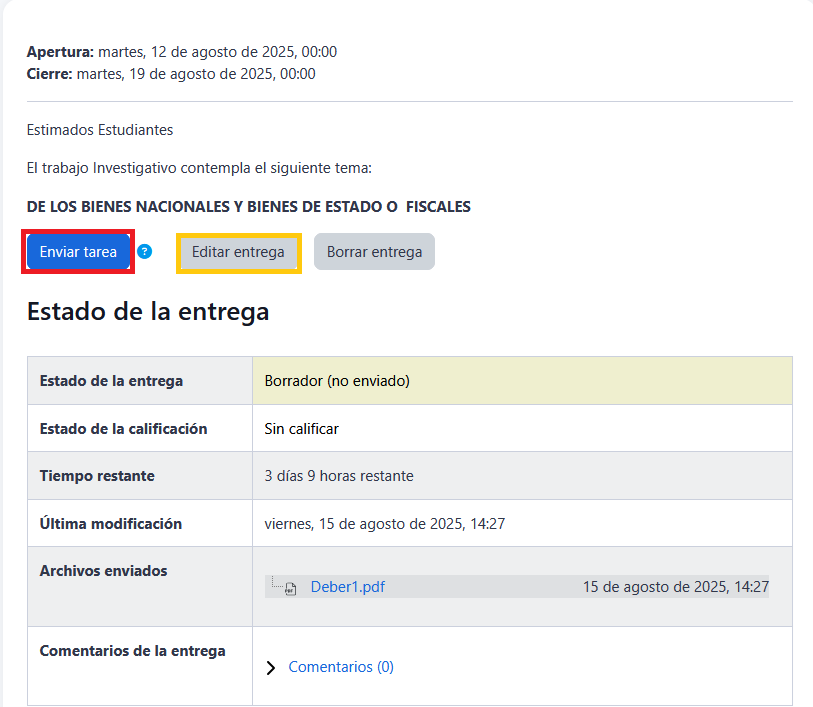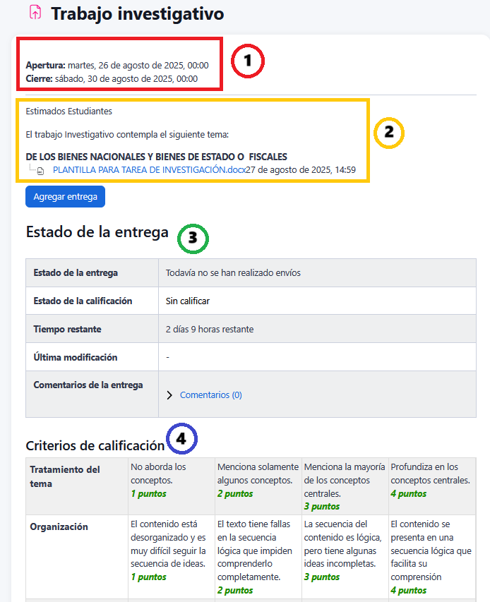 Nota: Se debe tomar en cuenta las fechas establecidas por el docente para subir los archivos en la plataforma. Todas las calificaciones de las tareas son registradas en el libro de calificaciones.