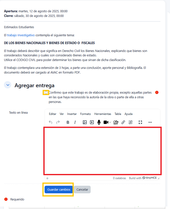 Luego de escibir su tarea en el editor de texto, para que se envíe su participación debe dar clic en el botón Guardar Cambios.