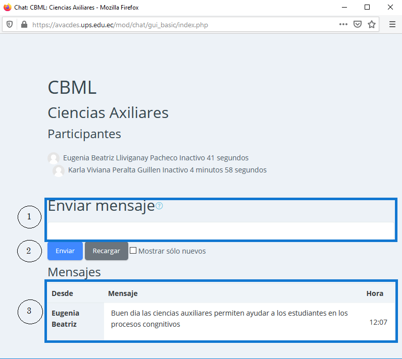 - Usar interfaz más accesible: Dentro del recuadro Enviar mensaje (1) coloque el texto que representa su participación y pulse Enviar (2). Las participaciones se colocarán dentro de una tabla ubicada en la parte inferior de la ventana emergente (3), donde se detallará el expositor, mensaje, hora y minuto.