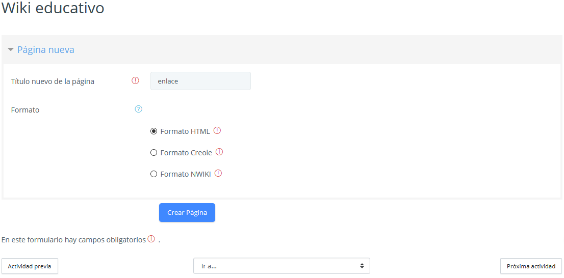 Si da clic sobre dicho enlace, da paso a crear una página nueva donde automáticamente toma el nombre del enlace para el Título nuevo de la página , seleccione el formato y pulse en Crear Página. Para que realice el proceso de la misma forma como lo ejecutó en la opción Editar.